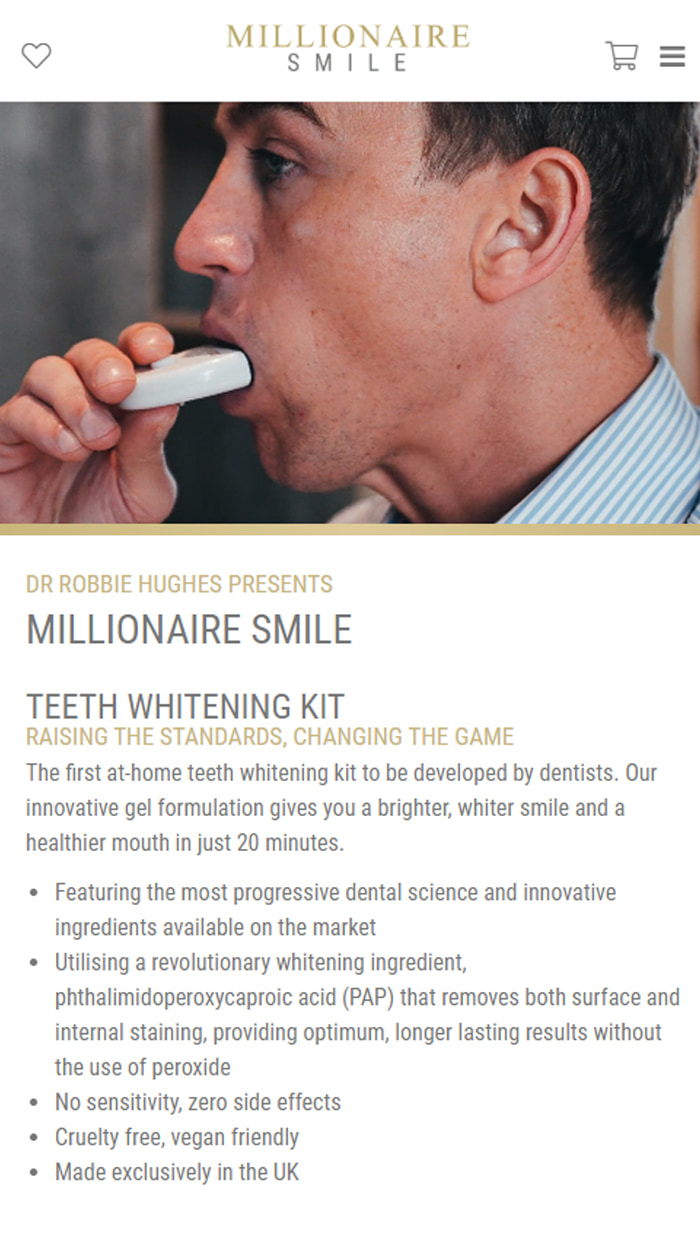 Robbie and his team approached us with a new vision. Alongside his dentistry centre, Robbie was launching a teeth whitening range of products aimed at revolutionising your smile. He wanted us to showcase the products and produce a visually pleasing website to entice customers.