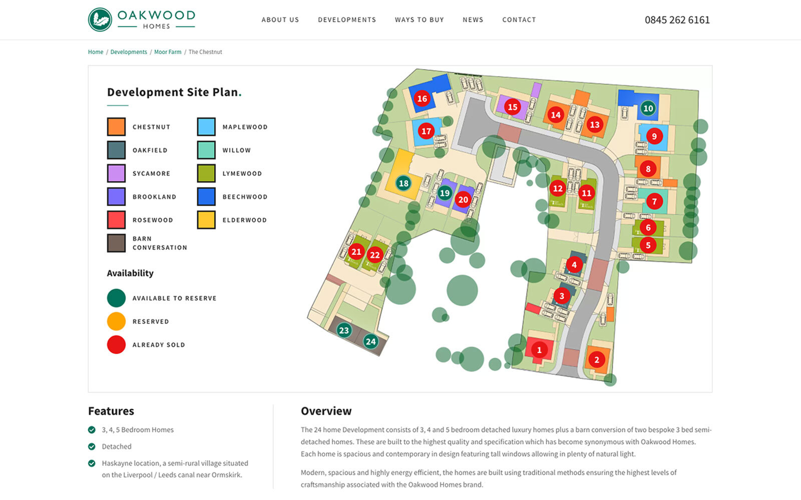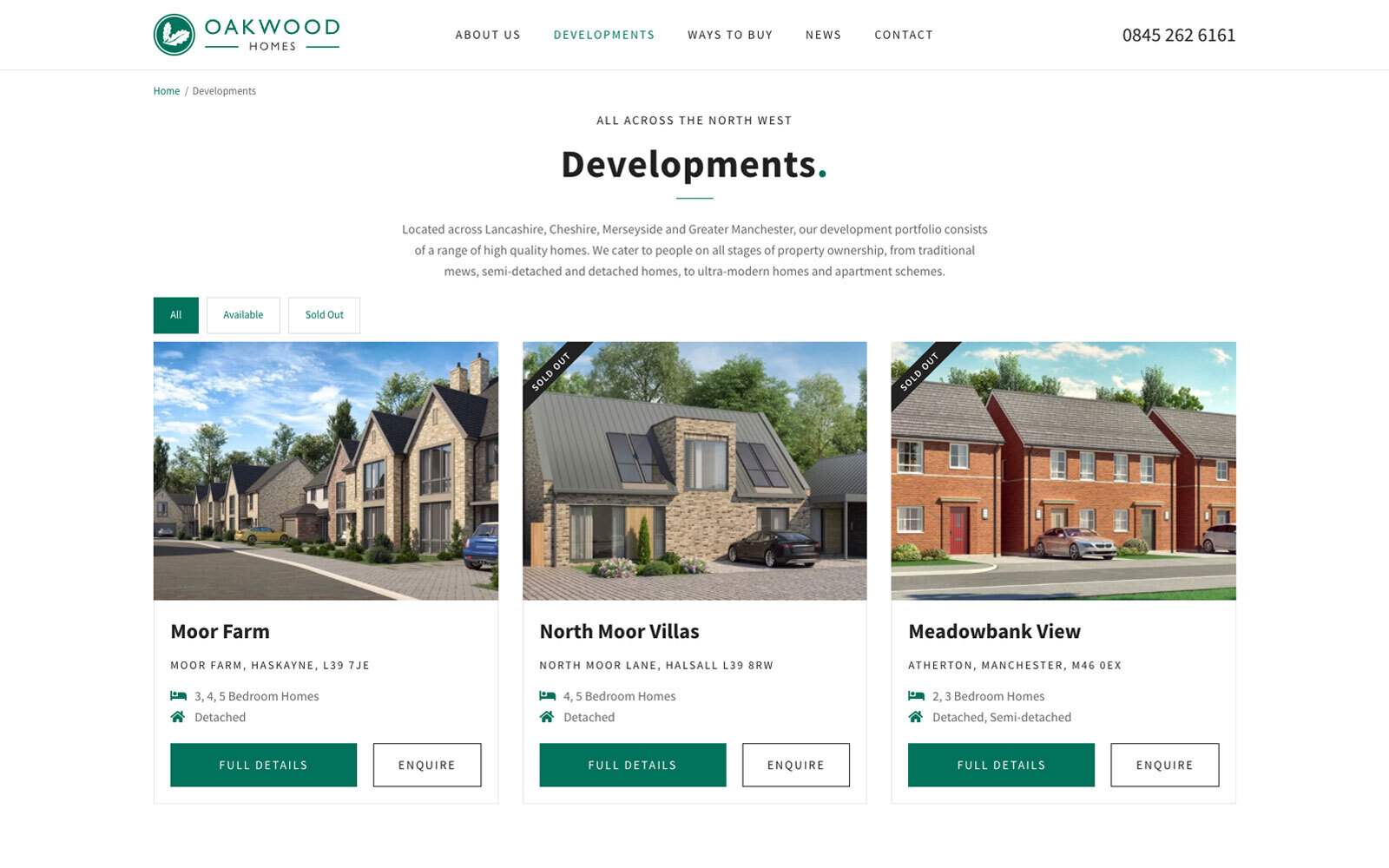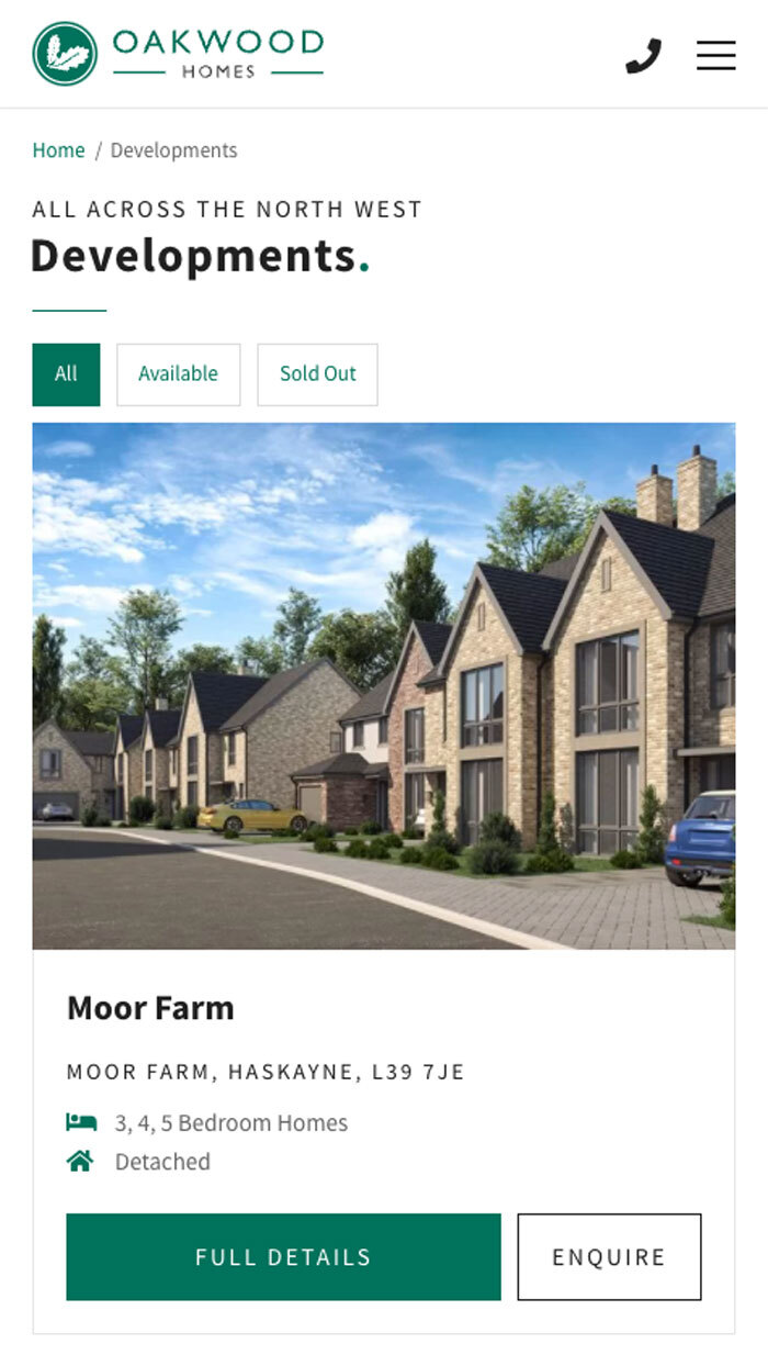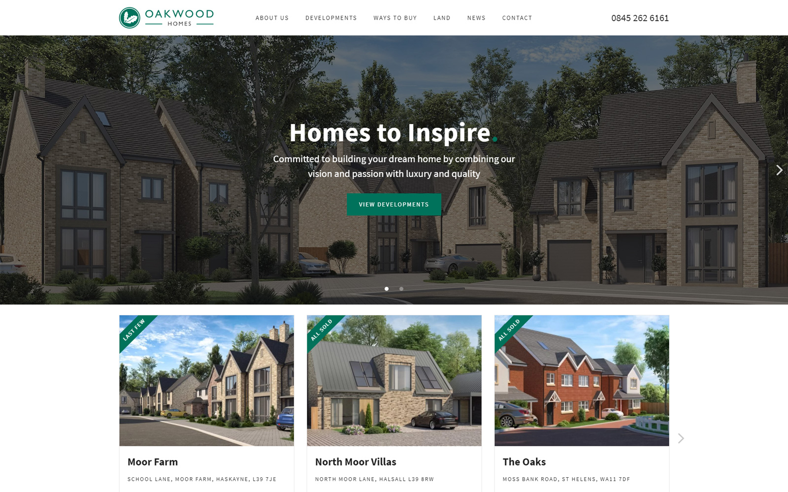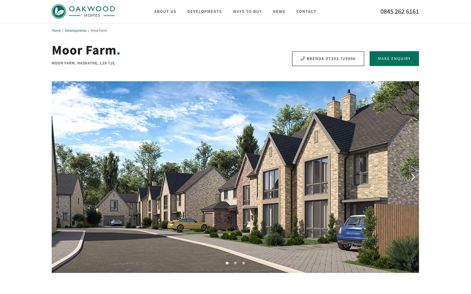 As a privately-owned family business, Oakwood Homes builds new homes in prime locations that are finished to the highest standard. Located in the North West, build and design are at the forefront of each and every house they construct. The Oakwood team wanted the same for their website; showcasing their new build properties with an easy and straightforward design that didn’t miss out on style.